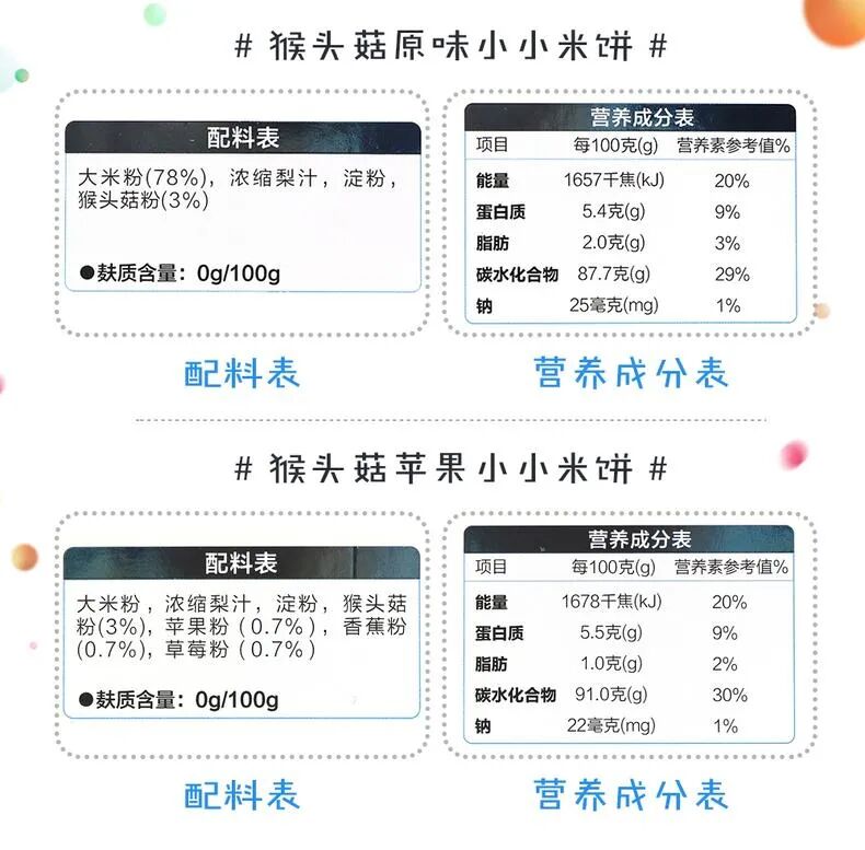 它们的主要成分都是大米、猴头菇粉和浓缩梨汁哦!水果小小米饼中含有苹果粉、香蕉粉和草莓粉;蔬菜小小米饼中还含有南瓜粉、胡萝卜粉、菠菜粉、卷心菜粉;营养成分表清晰可见,各有不同哦~
